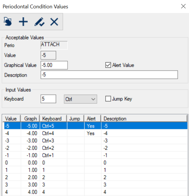 Periodontal Condition Values Window(Maintenance > Perio> Perio Conditions) The Periodontal Condition Values window allows you to specify the types and ranges of acceptable values for a perio condition. You can also indicate shortcut keys to make charting faster. It displays when you open the Periodontal Conditions window, select a listed condition and click the Values... button. ![]()