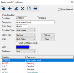 Periodontal Conditions WindowThe Periodontal Conditions window allows you to manage the perio conditions for use by your institution. ![]() You can configure which perio conditions are used at your institution. Note: Not all providers or departments need to chart the same conditions. axiUm has seven hard-coded perio condition types: