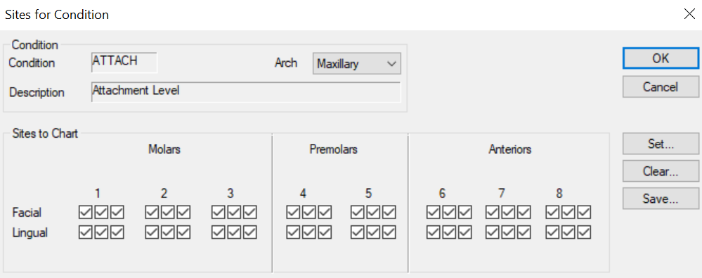 Sites for Condition Window(Maintenance > Perio > Perio Conditions) If a perio condition is configured to be charted on both sides of the tooth (Chart = Both Sides), you can manage how many times the condition can be charted per tooth in the Sites for Condition window. It displays when you open the Periodontal Conditions window, select a listed condition and click the Sites... button. Each tooth can have up to six values entered; three on the facial side and three on the lingual side and may vary based on the types of teeth being charted. ![]()