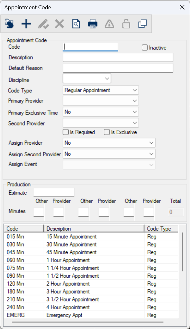 The Appointment Code window allows you to manage appointment codes.