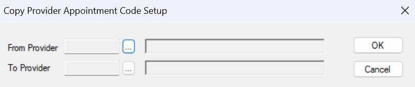 The Copy Provider Appointment Code Setup window allows you to copy the appointment code setup from one provider to another provider quickly. It displays when you open the Appointment Code window, select an appointment code, and click the Copy Provider Appointment Code Setup ( ) icon.