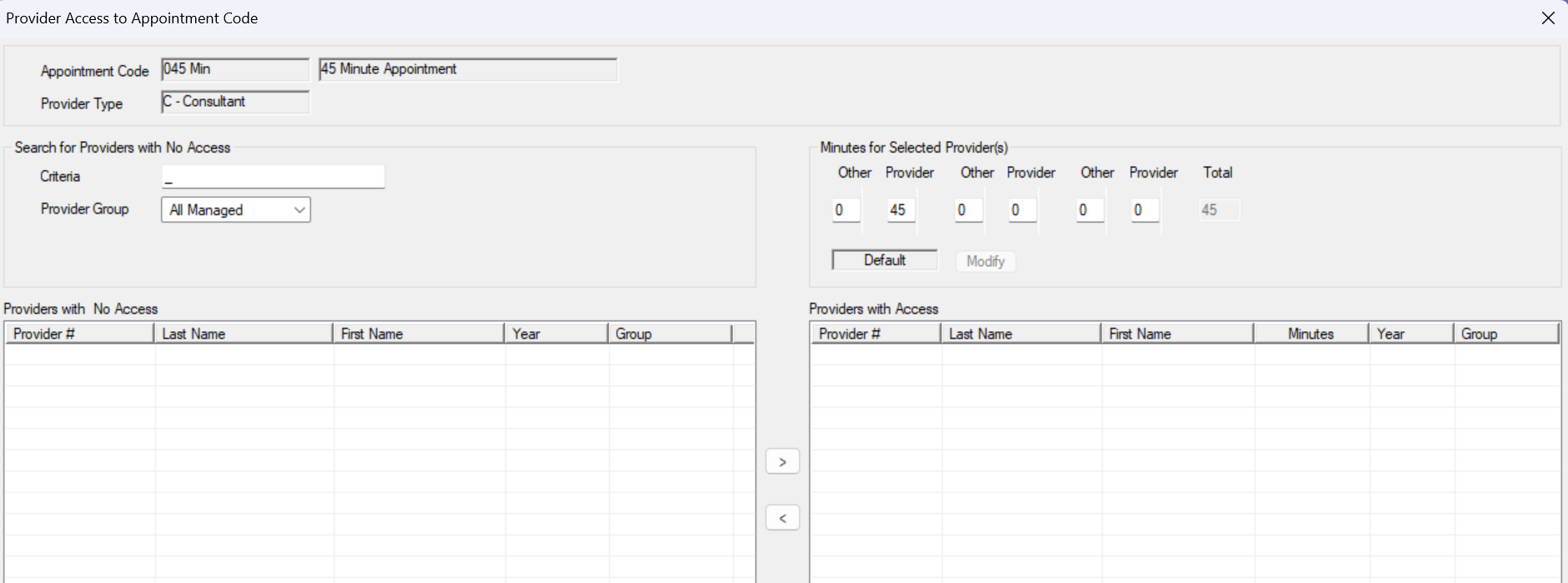 The Provider Access to Appointment Code window allows you to give specific providers access to the selected appointment code and also to change the default minutes for those providers.