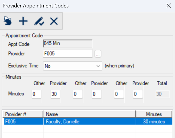 The window displays when you open the Appointment Code window, select an appointment code, and click the Provider Appointment Code ( ) icon.