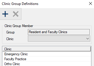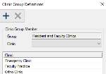 Clinic Group Definitions(Maintenance > Scheduler > Clinic Groups) The Clinic Group Definitions window allows you to specify the clinics within a clinic group. It displays when you open the Clinic Groups window, select a listed group and click the Clinic Group Definitions (