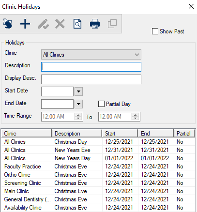 Clinic Holidays WindowHolidays are used in axiUm to mark a clinic as closed. Clinic holidays can apply to one or all clinics, and the duration of a holiday can range from hours to days. The Clinic Holidays window allows you to manage the list of clinic holidays and control the clinics that they apply to.