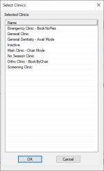 Select Clinic Window(Maintenance > Scheduler > Clinic Holidays) The Select Clinic window allows you to select a clinic to copy a clinic holiday to. It displays when you open the Clinic Holidays window and click the Copy Holiday (