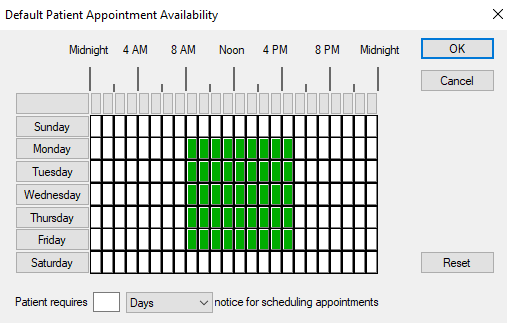 Default Patient Appointment Availability WindowWhen adding a patient to the wait list, you can specify the patient’s availability. This prevents you from trying to book patients when they are unavailable. The Default Patient Appointment Availability window allows you to specify the default availability to display when specifying a patient’s schedule.