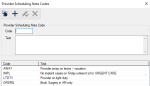 Provider Note Codes WindowProvider scheduling notes are used mainly in environments that have offsite/call center appointment booking. It is a way to display provider preferences and notes about how they prefer their appointments to be scheduled. While much of this can be programmed into scheduling rules, ideal day, and clinical limits, some preferences simply don’t fit or are more helpful to have as a reminder to staff when booking appointments. The Provider Note Codes window allows you to manage the list of predefined blocks of text that are used when adding provider notes. ![]()