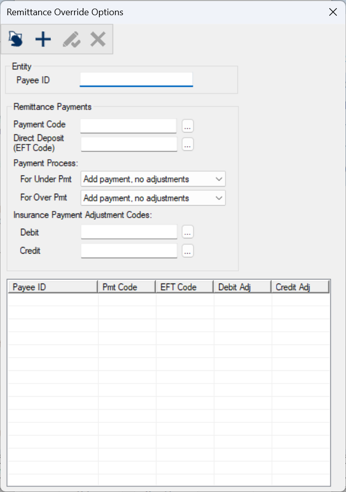 A button that displays the Remittance Override Options window and allows you to specify any payee related overrides.