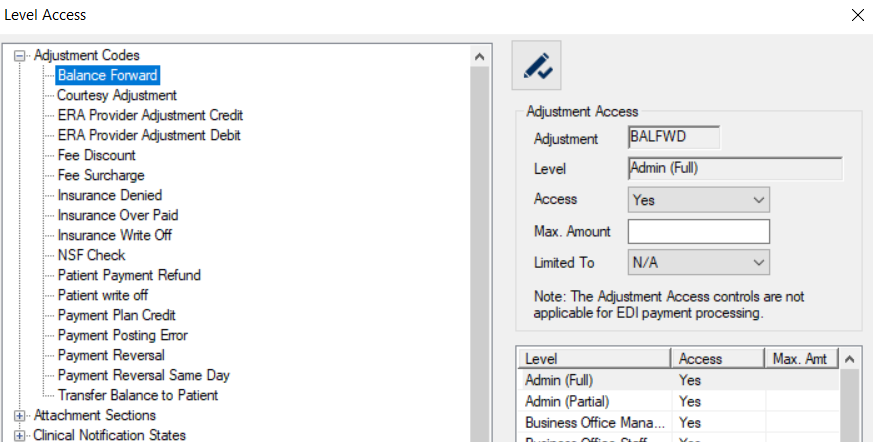 Level Access WindowMany windows in axiUm have access defined via Level Access windows that open when you click the Level Access ( The Level Access window allows you to review access levels for all windows that use this method of defining security. Note: The fields on the right vary depending on the selection made and will allow changes to all applicable security settings for the selection. Example: Adjustment codes have security settings for the fields Access, Max. Amount, and Limited To. ![]()