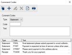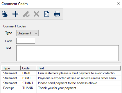 Comment Codes WindowThe Comment Codes window allows you to manage predefined blocks of text that can be added to statements or receipts when printed.