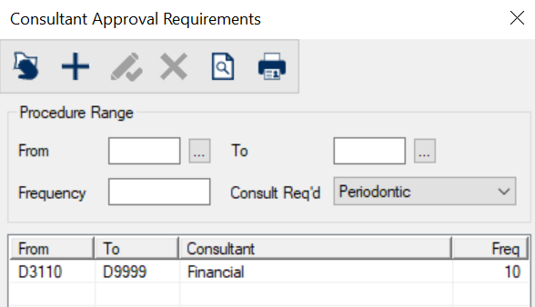Consultant Approval Requirements WindowThe Consultant Approval Requirements window allows you to specify procedure code ranges and the consultants required for those procedures.